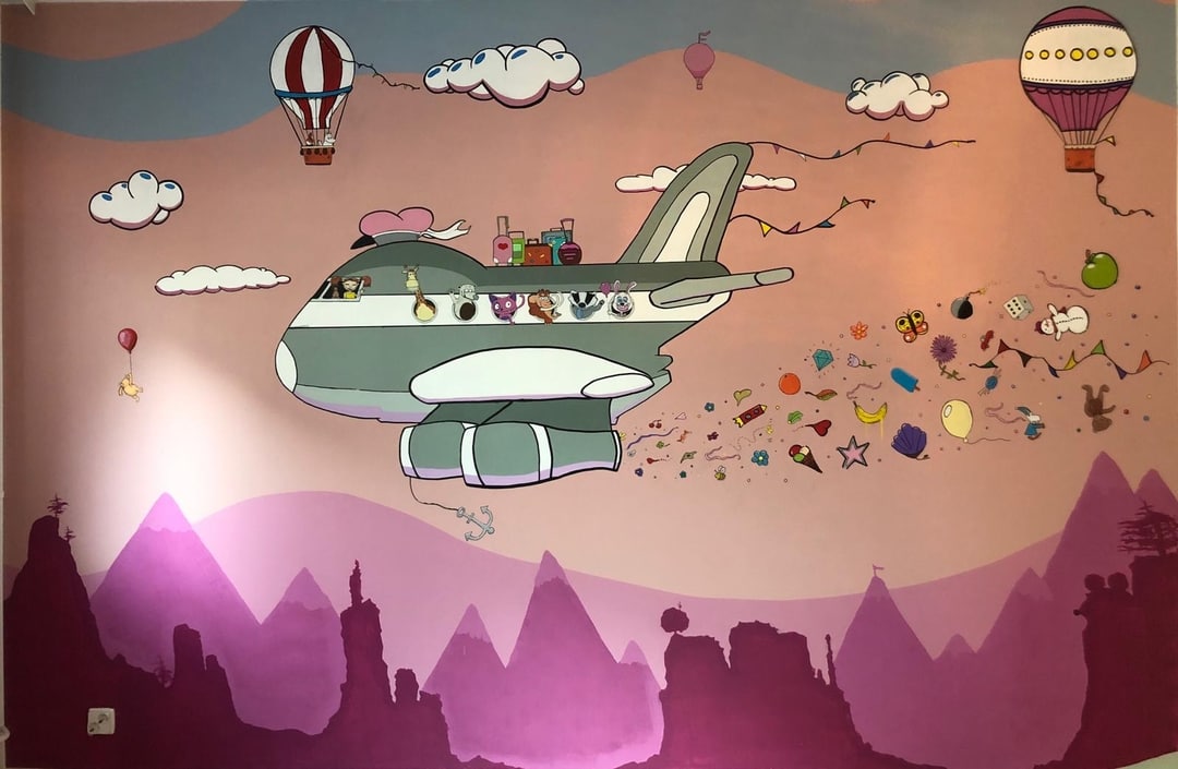 Toteutan paljon maalauksia yksityiskoteihin. Tämä maalaus on tosin hieman erilaisessa kodissa, nimittäin omassani. Maalasin teoksen tyttärelleni hänen prinsessahuoneeseensa. Suurin osa hahmoista olen suunnitellut alusta asti, ja mukana tietenkin on myös tuttuja hahmoja saduista ja kirjoista. Oli tärkeää, että maalauksessa tapahtui mahdollisimman paljon sillä lapset kyllästyvät helposti. Pakkasin muraalin täyteen hauskoja ja viihdyttäviä elementtejä hänen tutkittavaksi tuleviksi vuosiksi. Tyttäreni iltaisin tutkailee teosta sängystään mietteliäästi ja monesti toteaa nukkumaan mennessä korvaani kuiskaten: